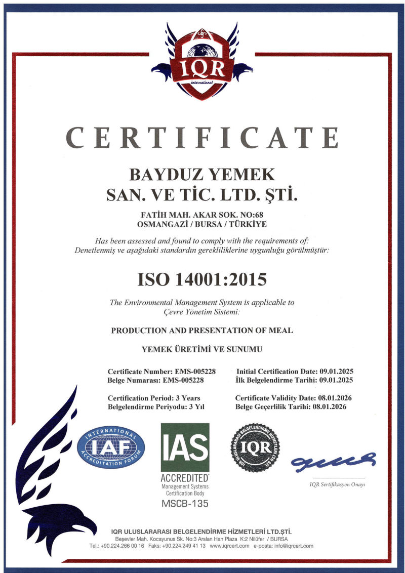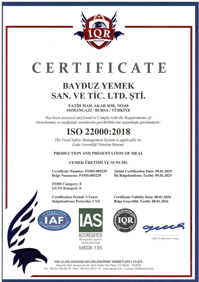 BAYDUZ YEMEK kaliteden en küçük bir ödün vermeden zamana karşı yarışır. Müşterinin talepleri doğrultusunda, istenilen yere, istenildiği saatte (7/24) hazır yemek, tabldot hizmetler vermektedir.